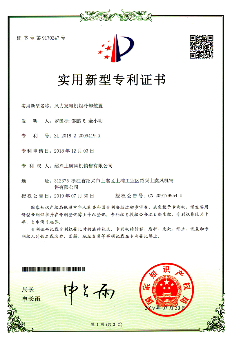 風(fēng)力發(fā)電機足冷卻裝置專利證書 |